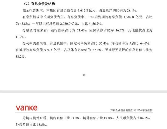 根据万科2024年年报,截至去年底,公司有息负债合计3612.8亿元,占总资产的28.1%;其中一年内到期部分为1582.8亿元,占比超过四成。