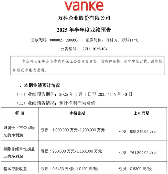 7月14日晚,万科发布业绩预告,预计2025年上半年净亏损将在100亿至120亿元之间。